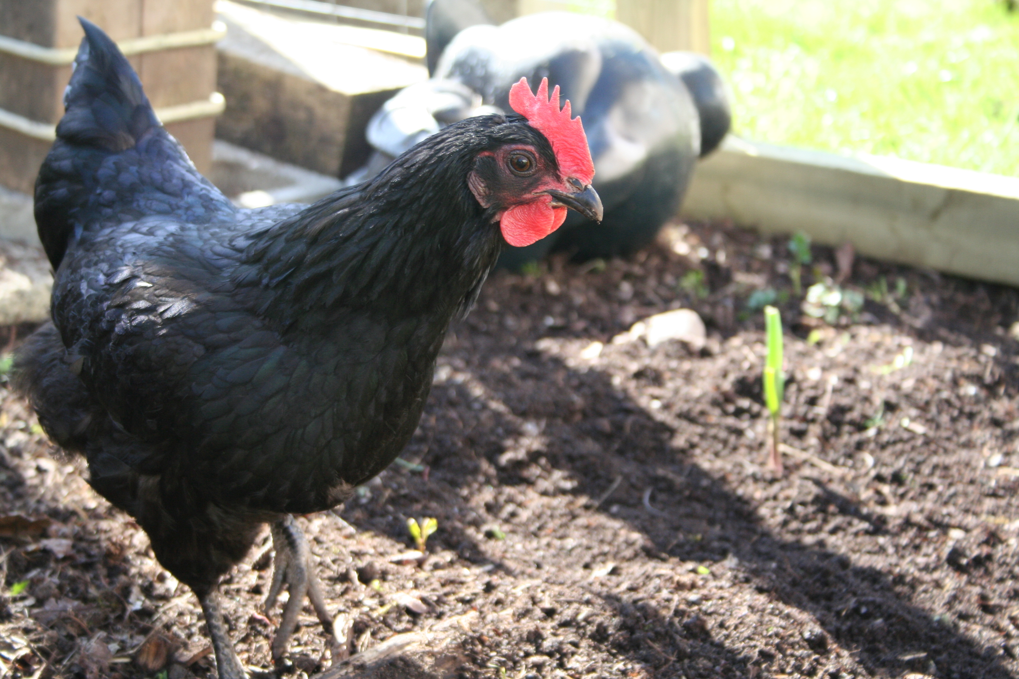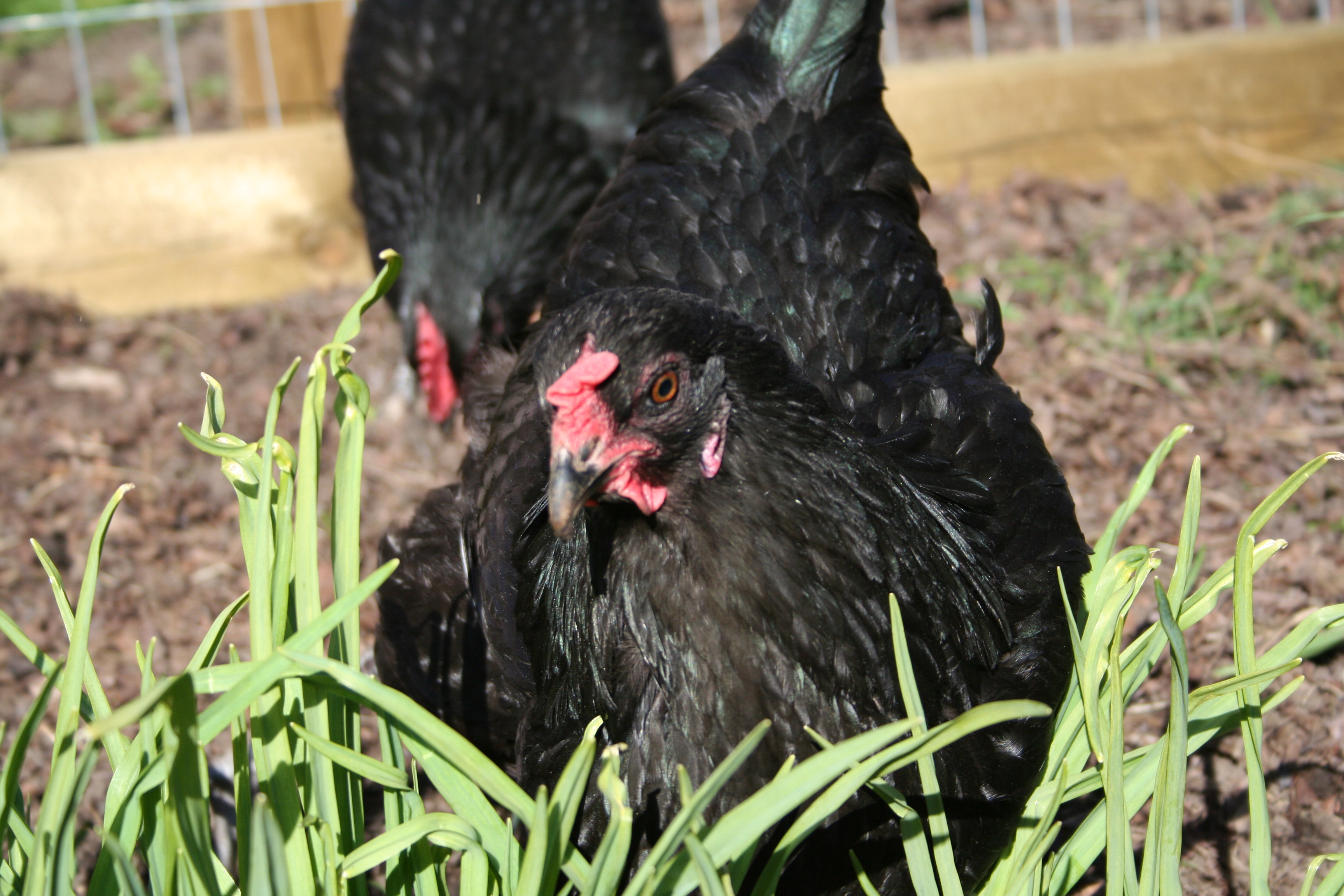The Chickens are outside and we have three of the original 5 chickens. Fluffy, Austin and Calvin. They are good girls, great layers and so much fun in the garden.